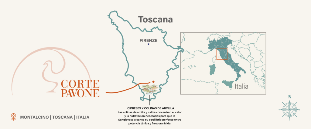 Corte Pavone cuenta con vinos increíbles y un entorno verdaderamente pintoresco: cipreses, una finca bañada por la luz del sol, viñedos y una vista sobre el famoso pueblo vinícola de Montalcino. Toscana en su máxima expresión.