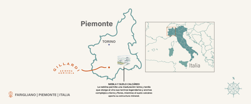 La histórica bodega familiar se encuentra en la colina de Corsaletto, donde la casa de campo del mismo nombre domina el anfiteatro natural de viñedos que se destaca en el lado sur, en dirección a Liguria/Alpes Marítimos. Fue a partir de aquí, hace muchos años, que la familia Gillardi comenzó su viaje, que hoy, como entonces, sigue produciendo Dolcetto, un vino de identidad, que refleja con orgullo y de manera absoluta los orígenes de la familia y el entorno en el que vive.