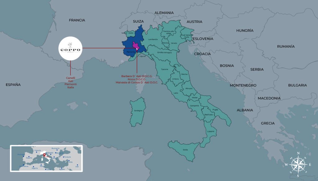 Piedmont is known for several prestigious designations of origin (DO). Coppo can produce wines under appellations such as Barbera d'Asti DOCG, Moscato d'Asti DOCG and Barolo DOCG. These appellations represent different styles of wine, from robust reds to sparkling wines and long-aged red wines.
