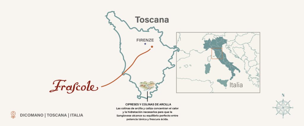 Frascole, una zona fronteriza. A pocos pasos, entre los viñedos o en el pequeño pueblo, la vista cambia de repente. Ahora miras a Mugello, ahora a Valdisieve, con la mirada hacia esas colinas lejanas que encierran Florencia. Importantes hallazgos arqueológicos atestiguan el cultivo de la vid en este suelo ya en la época de los etruscos.