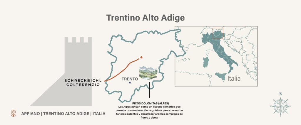 Alto Adigio, también conocido como Südtirol en alemán, es una región vinícola en la provincia autónoma de Bolzano, y se encuentra en el extremo norte de Italia. Las denominaciones de origen en esta región incluyen Alto Adigio DOC y varias subdenominaciones. Colterenzio puede producir vinos bajo la denominación Alto Adigio DOC, que abarca una amplia gama de estilos, desde blancos frescos hasta tintos estructurados.